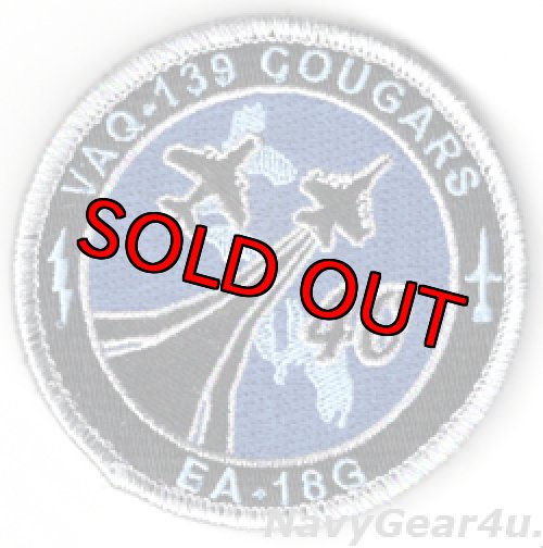 NASウィッドビーアイランドをホームベースとするCVW-17(NA)に所属するEA-18Gグラウラー飛行隊VAQ-139"クーガーズ"が 2023年7月1日に部隊創設40周年を迎えることを記念したショルダーバレットパッチ。同隊は1983年7月1日にEA-6B飛行隊として発足した飛行隊。パッチはEA-6BとEA-18Gのシルエットに「40」の文字がデザイン。最新の1枚。
