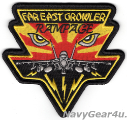 NASウィッドビーアイランドをホームベースとするCVWPのEA-18Gグラウラー飛行隊VAQ-138"イエロージャケッツ"(NL)の三沢PACOMディプロイメント展開記念EVIL EYES EA-18Gショルダーパッチ(RAMPAGEバージョン)。プラウラー時代からVAQ飛行隊では伝統のEVIL EYESを継承したデザイン。上部にバンブーレターで「FAR EAST GORWLER」その下に同隊のコールサイン"RAMPAGE"、EA-18Gの正面形と勇ましいエビルアイが旭日とともにデザイン。同隊は2024年3月から三沢にPACOMディプロイメント中。最新の1枚。