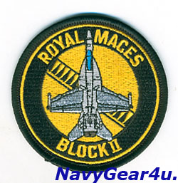 米海軍のF/A-18Eスーパーホーネット飛行隊VFA-27“ロイヤルメーセス"のF/A-18EブロックIIショルダーバレットパッチ。同隊は2013年にAESAレーダー搭載のF/A-18EブロックIIを受領、パッチはそのブロックIIを受領した記念バージョン。シャークティースと呼ばれる同隊伝統のストライプにF/A-18Eの上面形が部隊カラーに合わせた配色でデザイン。