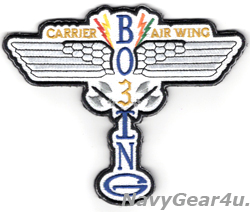 第3空母航空団CVW-3(NAC)のボーイング・トーテムパッチ。ボーイング伝統のトーテム(ボーイングの水上機トーテムの上面形をイメージ)ロゴをモチーフにCVW-3のインシグニアを配したデザイン。E-2C部隊以外の固定翼機部隊がすべてボーイング製のスーパーホーネット/グラウラーであることがボーイング航空団をイメージして製作された最新の1枚。VFA-32、VFA-83、VFA-94、VFA-131、VFA-105、VAQ-130などCVW-3所属スーパーホーネット/グラウラー飛行隊やCAGスタッフが背中などに着用するパッチ。