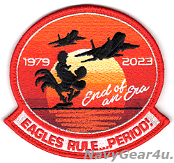 嘉手納基地に所属するF-15C飛行隊18WG/67FS "FIGHITING COCKS"が、2023年度中に部隊解散となることと、1979年から運用されたF-15Cの運用終了を記念したパッチ"End of an Era"(時代の終わり)。パッチは沈む夕日に2機のイーグルとCOCKのロゴに「EAGLES RULE...PERIOD!」の文字がデザイン。最新の1枚。
