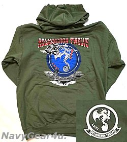 NASノーフォークをホームベースにMH-53EのFRS(機種転換)飛行隊HM-12"シードラゴンズ"のパーカー。バックには部隊名とインシグニアに、空母とMH-53Eがデザイン。フロントは左胸にワンポイントで部隊インシグニアがプリント。