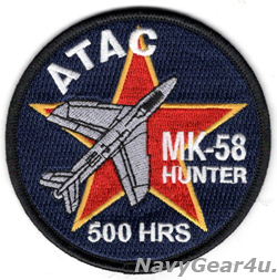 バージニア州ニューポートニューズに本社を置く仮想敵任務などを担う民間企業ATAC(Airborne Tactical Advantage Company)のMK-58ハンターでのフライト500時間を達成した搭乗員が着用する飛行時間達成記念ショルダーパッチ。パッチは仮想敵を意味するレッドスターにハンターの上面形と記念の文字がデザイン。