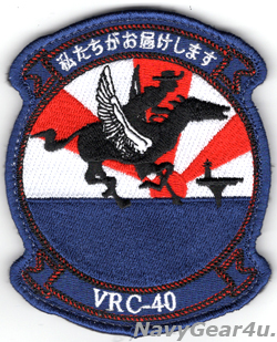 米海軍大西洋方面のC-2A COD(艦上輸送)飛行隊VRC-40"ロウハイド"が、オスプレイの不具合により急遽CMC-22Bを運用するVRM-30に替わって、CVW-11を搭載し西太平洋クルーズ中のCVN-71ルーズベルトに現在2機のC-2A(22/24)を派遣、COD任務を行なっている同隊の展開記念部隊パッチ。パッチはVRC-40のメインパッチをVRC-30のメインカラーであるブルーに変更、サンダウンパターンを黄/赤から旭日カラーに変更、またVRC-30と共同展開のためインシグニアもペガサスの羽根の生えたローハイドとなっている。VRC-30のモットー「WE DELIVER」も日本語で「私たちがお届けします」となっている。最新の1枚。