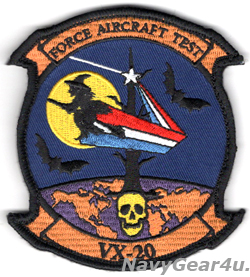 NASパタクセントリバーにおいて米海軍のあらゆる機体の運用試験を行なうVX-20"フォース"のハロウィーン用部隊パッチ。パッチはオリジナルの部隊パッチをモチーフに」魔女とバンパイア、スカルヘッドがデザイン。全体のカラーもオレンジのハロウィーンカラー。最新の1枚。