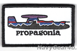 米海軍のE-2Dアドバンストホークアイの"Propagonia"ショルダーマスコットパッチ。パッチは某アウトドアブランドを模したユニークなデザインで、E-2Dの側面形に"Propagonia"のロゴがデザイン。