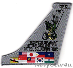 NASウィッドビーアイランドをホームベースとするCPRW-10傘下のP-8A飛行隊VP-4"スキニードラゴンズ"が2025年10月から2026年4月まで実施しているINDOPACOMディプロイメント記念パッチ。パッチは同隊のP-8Aポセイドンの垂直尾翼に、期間中天展開した各国国旗がデザイン。同隊は2025年4月からNAF嘉手納へ展開中。最新の1枚。