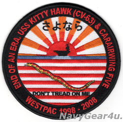 1998年からコンビを組んでいたCVW-5(第5空母航空団/NF)と空母CV-63キティホークが、CV-63の退役に伴いに離日、最後となることを記念したパッチ。パッチはさよならの文字にサンダウンとキティホーク、また当時米海軍最古艦であったキティホークを表す現役最古艦にかかげられるオールドネイビージャックが刺繍。当店デッドストック品。