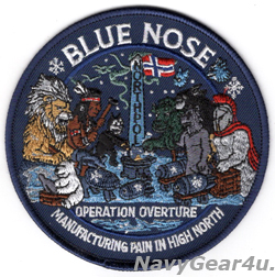 CVW-8(AJ)がCVN-78ジェラルド R.フォードに搭載され、2025年6月から実施中の北大西洋/Operation Epic Furyクルーズ2025-26記念パッチ"OPERATION OVERTURE"。パッチは北極点(North Pol)やノルウェー国旗、白熊、キャラクター化された各飛行隊のインシグニアが爆弾を運んでいるでデザイン。各飛行隊で使用されている最新のクルーズパッチ。今クルーズではイランとの緊張激化を受け、地中海からスエズ運河を通過し、紅海に移動、Operation Epic Furyに参加している。パッチのBLUE NOSEとは米海軍の北極圏を通過した乗員の伝統的な愛称。