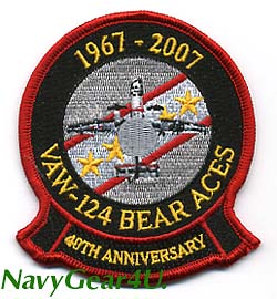 VAW-124"ベアエーセス"が今年2007年に部隊創設40周年を迎え、製作された記念パッチ。飛行隊名と年号、E-2Cの上面形と40周年を示す4つ星のラインがデザイン。タブには「40TH ANNIVERSARY」の文字。