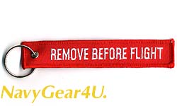 航空機のセーフティーピン風キーホルダー(キーリング)。両面に"REMOVE BEFORE FLIGHT"の文字が刺繍。