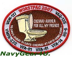 CVW-11(第11空母航空団/NH)が空母CVN-68ニミッツに搭載され、2007年4月から9月まで実施した西太平洋(ウエストパック)/ペルシャ湾クルーズの記念パッチ"WORSTPAC 2007"。このクルーズは乗艦したメンバーにとって最悪(WORST)だったため、WESTPACとかけてWORSTPACとしたユニークな記念パッチ。クルーズ中の寄港地が少なく最低だったことを表現するため、航海日数と寄港地を刺繍、最低(糞ったれ)=便器の意味を込めてトイレをデザイン。縁にはCVW-11所属各飛行隊名(VFA-14、VFA-81、VAW-117、VFA-41、VAQ-135、HS-6、VMFA-232)が刺繍。CVW-11所属各飛行隊のジャケットに。