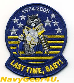 VF-32"スウォーズメン”が2005年にF-14トムキャットでの最後のクルーズを記念して製作した記念トムキャットマスコットパッチ"1974-2005 LAST TIME,BABY!"。同隊のマスコットパッチにF-14の運用年号とタブに「LAST TIME,BABY!」の文字をデザイン。