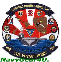 当時、CVW-5(第5空母航空団/NF)が空母CV-63キティホークに搭載され、実施したラストクルーズの記念パッチ"THE VOYAGE HOME 1998-2008"。今クルーズではハワイにてCVN-73ジョージ・ワシントンと交替予定であったが、火災等により遅延、急遽米本土のサンディエゴNBにおいてSWAPすることになり、RIMPAC演習後ハワイ経由で東太平洋を航海、本土に到着している。パッチは旭日をバックに航行するキティホークとCVW-5所属全飛行隊のインシグニアが刺繍、さらに今回の寄港地であるグアム、ハワイ、サンディエゴと一部艦載機が展開したNASファロンのマップがデザイン。左右12.6cmの迫力の1枚。当店デッドストック品。