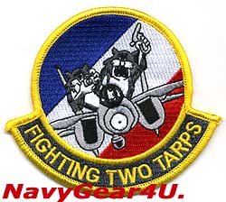 VF-1とともに活躍したF-14トムキャット飛行隊VF-2"バウンティハンターズ"のTARPSショルダーマスコットパッチ(Ver.2)。TARPSとはトムキャットが有する戦術航空偵察ポッドシステムのよる偵察ミッションのことで、パッチは部隊伝統のラングレイストライプにカメラを持ったトムキャットマスコット(NFO)がトムキャットに乗って偵察をしているユニークなデザイン。タブの中の文字が「FIGHTING TWO TARPS」と刺繍されたバージョン。