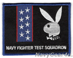 当時、ポイント・マグーにおいて米海軍のF-14を含む運用試験を行なっていた試験評価飛行隊VX-9 "バンパイアズ"Det.ポイントマグーのプレイボーイ・バニーマスコットパッチ。同隊のマスコットキャラクターであるプレイボーイ・バニーと「NAVY FIGHTER TEST SQUADRON」の文字、ヘルメットと同じ9スターをアレンジしたデザインに「VAMPIRES」の文字。チャイナレイク移動前の貴重な1枚。当店デッドストック品。