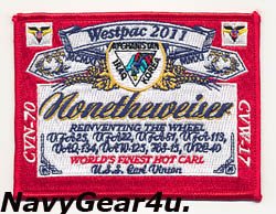 CVW-17(第17空母航空団/AA)が空母CVN-70カールビンソンに搭載され2011年11月から2012年5月まで実施したウエストパッククルーズ記念パッチ"None the weiser(何も変わらない)WORLD'S FINEST HOT CARL"。パッチはバドワイザーのラベル風にアレンジされたデザインでCVW-17のインシグニアにイラク、アフガニスタン、韓国の文字とCVW-17所属全飛行隊名など刺繍。当店デッドストック品。