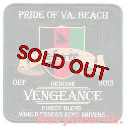 米海軍のF/A-18Eスーパーホーネット飛行隊VFA-143"ピューキンドッグス"がCVW-7(AG)の一員としてCVN-69アイゼンハワーに搭載され、2013年2月から7月まで実施した地中海/北アラビア海、オペレーション・エンデューリングフリーダム作戦クルーズの記念パッチ”PRIDE OF VA.BEACH”(バージニアビーチの誇り)。バージニアビーチとはホームベースNASオシアナ周辺の海軍のクルーが多く在住するエリア。パッチに書かれた「VENGEANCE」は復讐の意味。某有名アルコール飲料のラベルを模したユニークなデザイン。