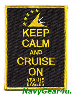 米海軍のF/A-18Eスーパーホーネット飛行隊VFA-115"イーグルス"が、CVW-5(NF)の一員として、空母CVN-73ジョージ・ワシントンに搭載され、2013年9月から21月まで実施したウエストパッククルーズの最新記念パッチ"KEEP CALM AND CRUISE ON"。パッチは最近T-シャツなど様々なアパレル商品に使われていて流行中の「KEEP CALM AND CARRY ON」という第二次世界大戦時、イギリス政府が国民に落ち着かせるように送ったメッセージポスターをアレンジしたデザイン。落ち着いてクルーズを実施しようという意味。部隊インシグニアと部隊カラーでアレンジした1枚。