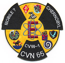 2012年12月に退役した米海軍初の原子力空母CVN-65エンタープライズと搭載されていた空母航空団CVW-1(AB)のラストクルーズ時に製作された退役記念のMOBILE? CHERNOBYLパッチ。CVN-65伝統のラジエーションマークをモチーフとして所属各飛行隊の部隊インシグニアをちりばめたデザイン。