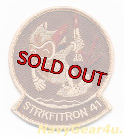 CVW-9(NG)のF/A-18Fスーパーホーネット飛行隊VFA-41"ブラックエーセス"のミサイルチャッカーショルダーパッチ(デザート)。同隊伝統のキャラクターであるミサイルを持ったカードのオバケ"ミサイルチャッカー"とタブに「STRKFITRON 41」の文字がデザイン。F-14時代のショルダーパッチのデザインを踏襲。毎週決まった日や中東方面へのディプロイメント時に着用するデザートカラー。