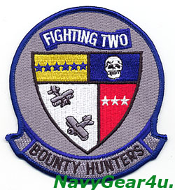 米海軍のF/A-18Fスーパーホーネット飛行隊VFA-2"バウンティハンターズ"の部隊パッチ(現行バージョン)。デザインは90年代から現在に至るまで使用されている伝統のモノで小変更が重ねられ現在に至っている。