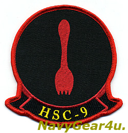 米海軍のMH-60S飛行隊HSC-9"トライデンツ"の部隊パッチ(JOPAバージョン)。下級士官用のジョーク部隊パッチで、「JOPA」とはJunior Officer's Protection Association(下級士官保護協会)といったような意味合いで、シニアと呼ばれる少佐や中佐などの佐官からジュニアオフィサー(JO)がイジメや嫌な仕事をおしつけられないように訴えかけたジョークパッチ。通常のトライデントのインシグニアが半人前の若手士官を意味して、ベビー用のかわいいスプーン・フォークに変更されたユニークな1枚。同隊はNASノーフォークをホームベースにCVW-8(AJ)に所属。同隊は最新マルチミッションヘリコプターMH-60Sナイトホークを運用する部隊。JOPAショルダーパッチと合わせて使用。