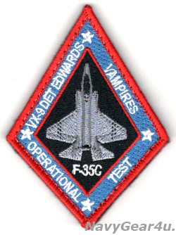 NAWSチャイナレイクにおいて米海軍・海兵隊のあらゆる機体のオードナンス運用試験を行なう試験評価飛行隊VX-9 "バンパイアズ"が、F-35CライトニングIIの運用評価試験を行なうため、エドワーズAFBに所在する分遣隊のF-35CライトニングIIショルダーパッチ。部隊パッチに合わせた配色で、F-35の上面形に「VX-9 DET EDWARDS VAMPIRES OPERATIONAL TEST」の文字がデザイン。