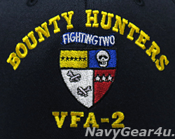 CVW-2(NE)に所属するF/A-18Fスーパーホーネット飛行隊VFA-2"バウンティハンターズ"の部隊オフィシャルボールキャップ(コマンドボールキャップ)。フロントに伝統の部隊インシグニアと部隊名を刺繍。バックにはワンポイントで同隊伝統のラングレイストライプが刺繍。近年多くの飛行隊が採用するFLEX FITタイプのキャップを採用した現行キャップ。
