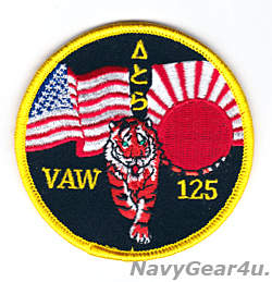 VAW-115に替わってCVW-5(NF)に編入されたE-2Dホークアイ飛行隊VAW-125"タイガーテイルズ"のFDNFショルダーバレットパッチ。パッチは在日部隊となったことを記念して星条旗と旭日旗に部隊名とタイガーがデザイン。デルタ△(デルタとはDを表すフォネティックスコードで通称E-2デルタと呼称されている)と「とら」のひらがなをあしらった1枚。FDNFとはForward Deployed Naval Force(前方展開米海軍部隊)の略。