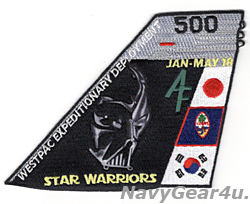 NASウィッドビーアイランドをホームベースとするCVWP(TSW)のEA-18Gグラウラー飛行隊VAQ-209"スターウォーリアーズ"(AF)の2018年のPACOMディプロイメントを記念したパッチ"WESTPAC EXPEDITIONARY DEPLOYMENT"。同隊はVAQ-134と交替し2018年1月から5月までPACOMディプロイメント部隊としてコースノースグアム参加から、NAF三沢に展開、この間に三沢だけでなく、韓国へも展開している。パッチは同隊のEA-18G CVWP司令機"VADER ONE"(AF500)の垂直尾翼を象ったデザインで、ベイダーヘッドはリアルなハイブリッド仕様とした1枚。遠征中に訪問した日の丸、グアム州旗、韓国国旗がラダーにデザイン。