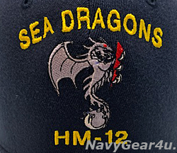 NASノーフォークをホームベースにMH-53EのFRS(機種転換)飛行隊として2015年10月1日付で復活再編成されたHM-12"シードラゴンズ"の部隊オフィシャルボールキャップ(コマンドボールキャップ)。部隊インシグニアの機雷を尻尾で掴み、ライトニングを手にするシードラゴンを刺繍したデザイン。近年多くの飛行隊が採用するFLEX FITタイプのキャップを採用した現行キャップ。