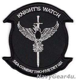 グアムのアンダーセンAFBに本隊のあるMH-60S飛行隊HSC-25"アイランドナイツ"(RB)のNAF厚木をショアべースとする分遣隊DET-6"ナイツウォッチ"の部隊パッチ。DET-6B(2019年5月からの新DETチーム)の部隊パッチで、黒地に全て銀糸で部隊名、サーベルに鳥がデザイン、同隊はマルチミッションヘリコプターMH-60Sナイトホークを運用する部隊。最新DET-6Bチームのパッチ。