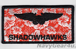 MCAS岩国のCVW-5に所属するEA-18Gグラウラー飛行隊VAQ-141"シャドウホークス"のSFARP戦闘攻撃機先進即応プログラムGUAM DET 2020展開記念のNFO(EWO/電子戦士官)ネームタグ。タグは南国らしく、ハイビスカスパターンのバックにブラックでNFOウイングが刺繍。揃いの部隊パッチ、ショルダーパッチとともに使用。
